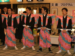 | NPO法人人形浄瑠璃文楽座設立五周年記念の「御贔屓様の集い」が開催されました。 日頃ご支援いただいてます NPO法人の会員の皆様をご招待して楽しんでいただく 催しです。 一 三味線組曲 二 二人禿 三 座談会 四 天地会「新版歌祭文 野崎村の段」 義太夫三味線十六丁による組曲は圧巻です! 「二人禿」は簑助師匠と勘十郎で、本公演では見られないでしょう・・・ 重要無形文化財保持者による座談会の後は、お待ちかねの天地会! 大夫・三味線が人形を遣い、人形遣いが三味線を弾き、語るのです 場内は笑いの渦が・・・笑っては失礼だと思う程、何故か可笑しいのです。 |